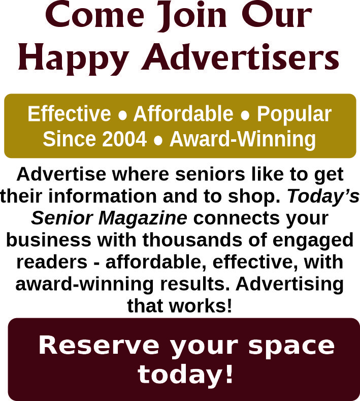 There is a strong loyalty our readers feel toward our advertisers. They understand that Today’s Senior Magazine is free to them because our advertisers provide the essential revenue that allows us to publish each month. Our advertisers truly partner with us to reach local and statewide seniors, delivering important and informative content they look forward to every issue.